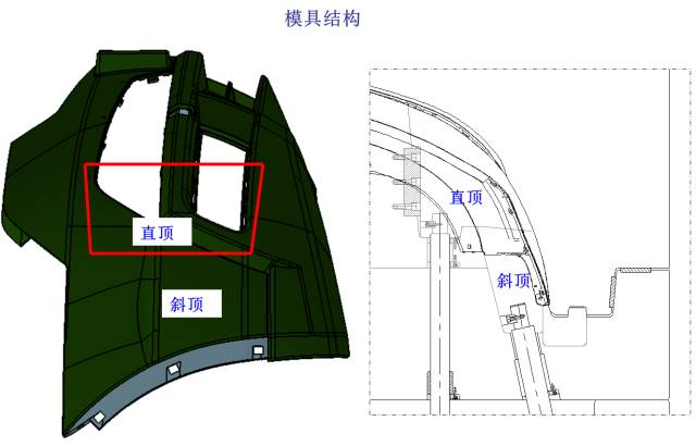 如下圖所示,產(chǎn)品兩頭采用直頂+斜頂?shù)臋C構(gòu)進行脫模。