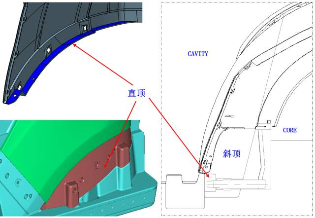 扣位采用在直頂上做隧道彈塊的結(jié)構(gòu)進行脫模: